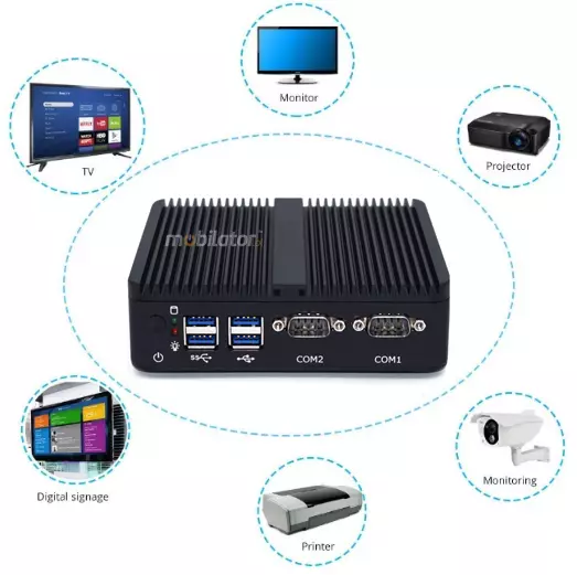 Dzięki niewielkim wymiarom MiniPC ma wszechstronne zastosowanie zarówno w domu, w biurze jak i w przemyśle na przykład na hali produkcyjnej. Zmieści się dosłownie wszędzie, a dzięki mocowaniu VESA można go zamontować z tyłu monitora w celu optymalizacji stanowiska pracy.