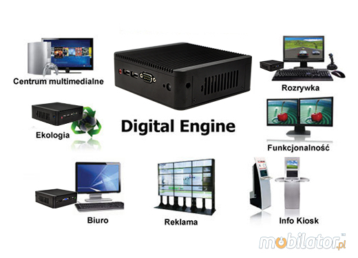 Dzięki zastosowaniu najnowszych technologii Digital Engine jest przystosowany do ciągłej wielozadaniowej pracy przy niskim zużyciu energii. Istotną zaletą jest skuteczne połączenie małych wymiarów ze sporymi możliwościami poprzez użycie procesorów z rodziny Intela, chipsetu Intela oraz pamięci DDR3 2GB. Zintegrowane układy wideo Intel HD Graphics i audio Realtek ALC662 pozwalają na odtwarzanie szerokiego zakresu aplikacji oraz plików multimedialnych (obraz, dźwięk) - w jakości Full HD. Przestrzeń dyskowa oferuje do dyspozycji od 16GB SSD do 128GB SSD (opcjonalnie też dysk HDD).