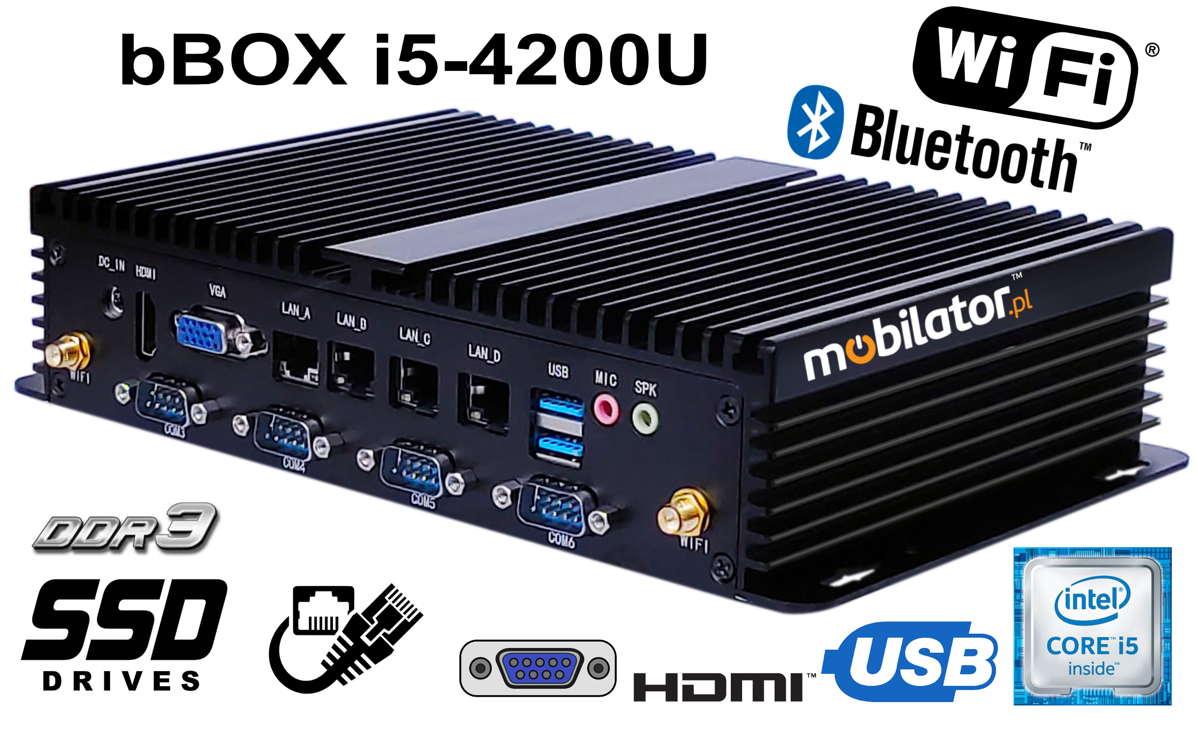 Niewielkich wymiarów komputery przemysłowe przodują w środowiskach, w których dominują kurz, brud i wilgoć. Są idealne do zastosowań wymagających cichej pracy. Małe i niezawodne MiniPC korzystają z technologii heat-pipe i lamel z aluminium dla pasywnego chłodzenia. Wytrzymały mini Komputer Przemysłowy bBOX i5-4200U to urządzenie przeznaczone do wszelkich zastosowań przemysłowych i nie tylko, wymagających ciągłej pracy - 24 godziny, 7 dni w tygodniu.