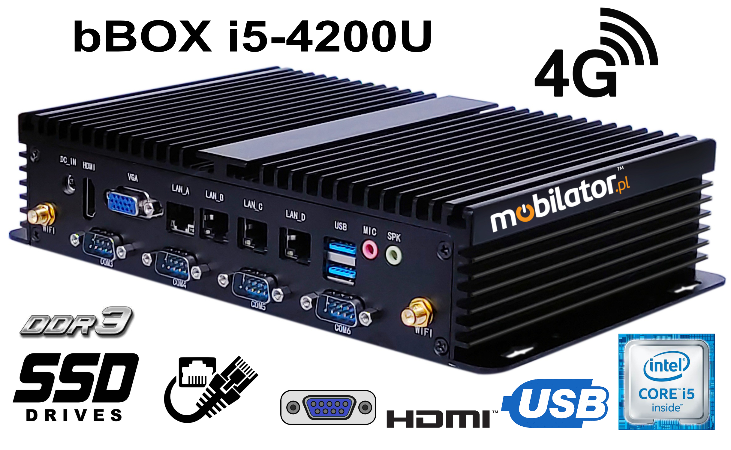 Niewielkich wymiarów komputery przemysłowe przodują w środowiskach, w których dominują kurz, brud i wilgoć. Są idealne do zastosowań wymagających cichej pracy. Małe i niezawodne MiniPC korzystają z technologii heat-pipe i lamel z aluminium dla pasywnego chłodzenia. Wytrzymały mini Komputer Przemysłowy bBOX i5-4200U to urządzenie przeznaczone do wszelkich zastosowań przemysłowych i nie tylko, wymagających ciągłej pracy - 24 godziny, 7 dni w tygodniu.