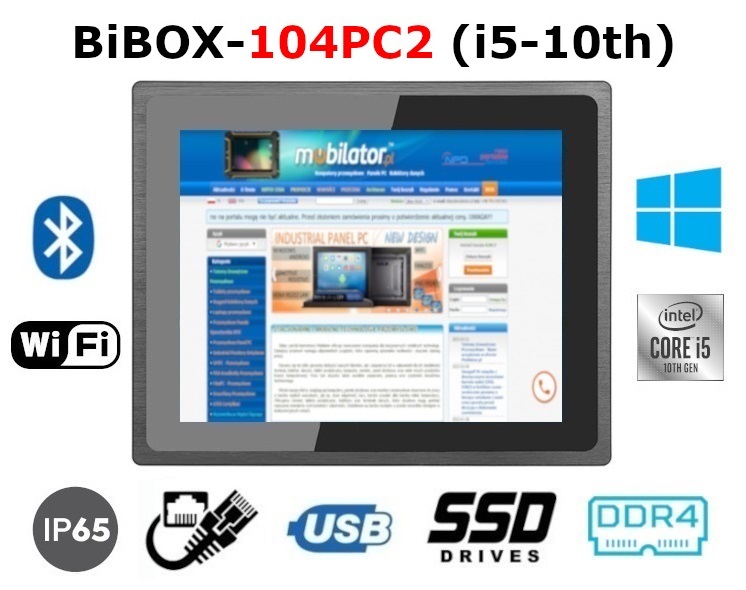 Wzmocniony, metalowy Panel PC przemysłowy BiBOX-104PC2 (i5-10th) posiada odporny na wodę i zadrapania ekran 10.4". Rozdzielczość 1024x768 oferuje dobrą jakość obrazu, a wysoka jasność ekranu 350 nitów daje lepsze nasycenie barw i kontrast, oraz pozwala na znacznie poprawioną widoczność nawet w przypadku padających na ekran promieni słonecznych. Wyświetlacz typu pojemnościowego zapewnia użytkownikowi wyraźny obraz i łatwość obsługi przy pomocy dotyku.