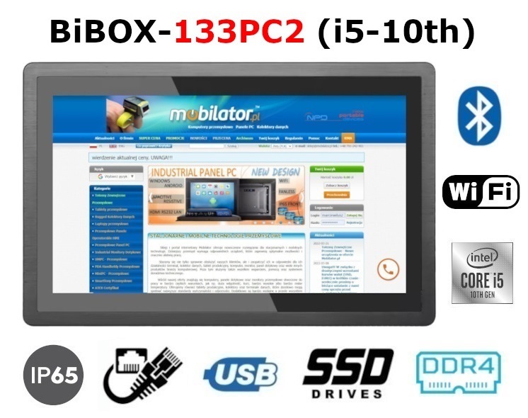 Wzmocniony, metalowy Panel PC przemysłowy BiBOX-133PC2 (i5-10th) posiada odporny na wodę i zadrapania ekran 13.3". Rozdzielczość 1920x1080 oferuje dobrą jakość obrazu, a wysoka jasność ekranu 250 nitów daje lepsze nasycenie barw i kontrast, oraz pozwala na znacznie poprawioną widoczność nawet w przypadku padających na ekran promieni słonecznych. Wyświetlacz typu pojemnościowego zapewnia użytkownikowi wyraźny obraz i łatwość obsługi przy pomocy dotyku.