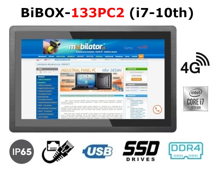 Wzmocniony, metalowy Panel PC przemysłowy BiBOX-133PC2 (i7-10th) posiada odporny na wodę i zadrapania ekran 13.3". Rozdzielczość 1920x1080 oferuje dobrą jakość obrazu, a wysoka jasność ekranu 250 nitów daje lepsze nasycenie barw i kontrast, oraz pozwala na znacznie poprawioną widoczność nawet w przypadku padających na ekran promieni słonecznych. Wyświetlacz typu pojemnościowego zapewnia użytkownikowi wyraźny obraz i łatwość obsługi przy pomocy dotyku.