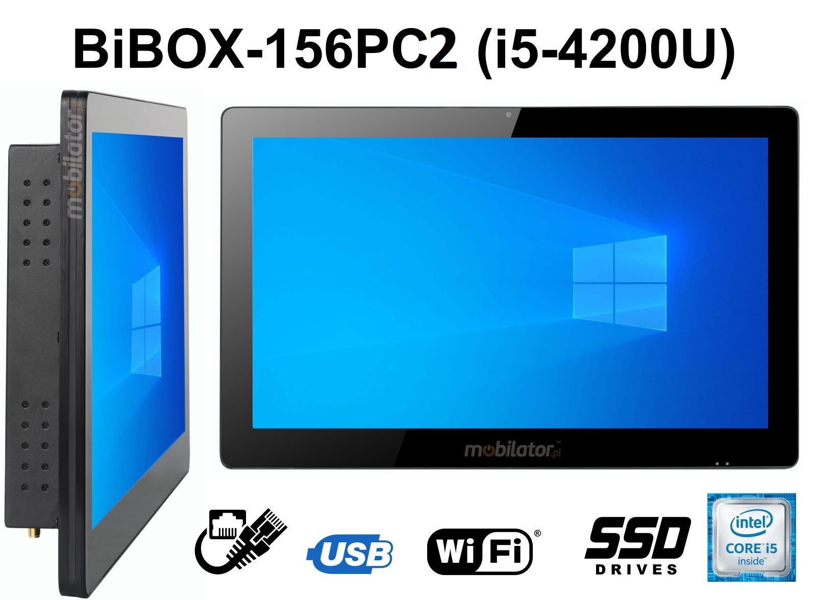 Wzmocniony, metalowy Panel PC przemysłowy BiBOX-156PC2 posiada odporny na wodę i zadrapania 15.6" ekran LED. Rozdzielczość 1920x1080 oferuje dobrą jakość obrazu, a wysoka jasność w zakresie 300 cd/m² daje lepsze nasycenie barw i kontrast oraz pozwala na znacznie poprawioną widoczność nawet w przypadku padających na ekran promieni słonecznych. Wyświetlacz typu pojemnościowego zapewnia użytkownikowi wyraźny obraz i łatwość obsługi przy pomocy dotyku.