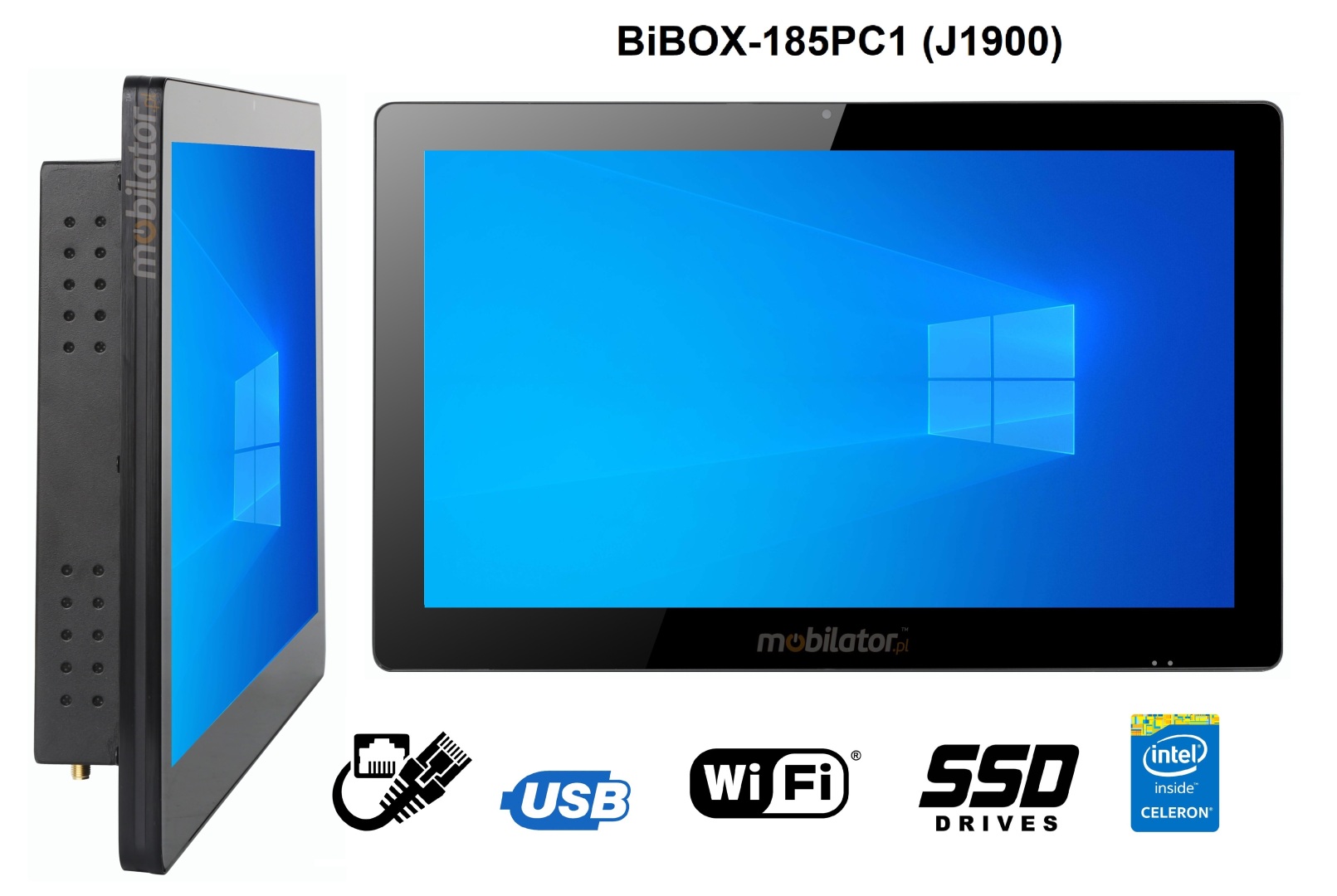 Wzmocniony, metalowy Panel PC przemysłowy BiBOX-185PC1 posiada odporny na wodę i zadrapania 18.5" ekran LED. Rozdzielczość 1366x768 oferuje dobrą jakość obrazu, a wysoka jasność w zakresie 250 cd/m² daje lepsze nasycenie barw i kontrast oraz pozwala na znacznie poprawioną widoczność nawet w przypadku padających na ekran promieni słonecznych. Wyświetlacz typu pojemnościowego zapewnia użytkownikowi wyraźny obraz i łatwość obsługi przy pomocy dotyku.
