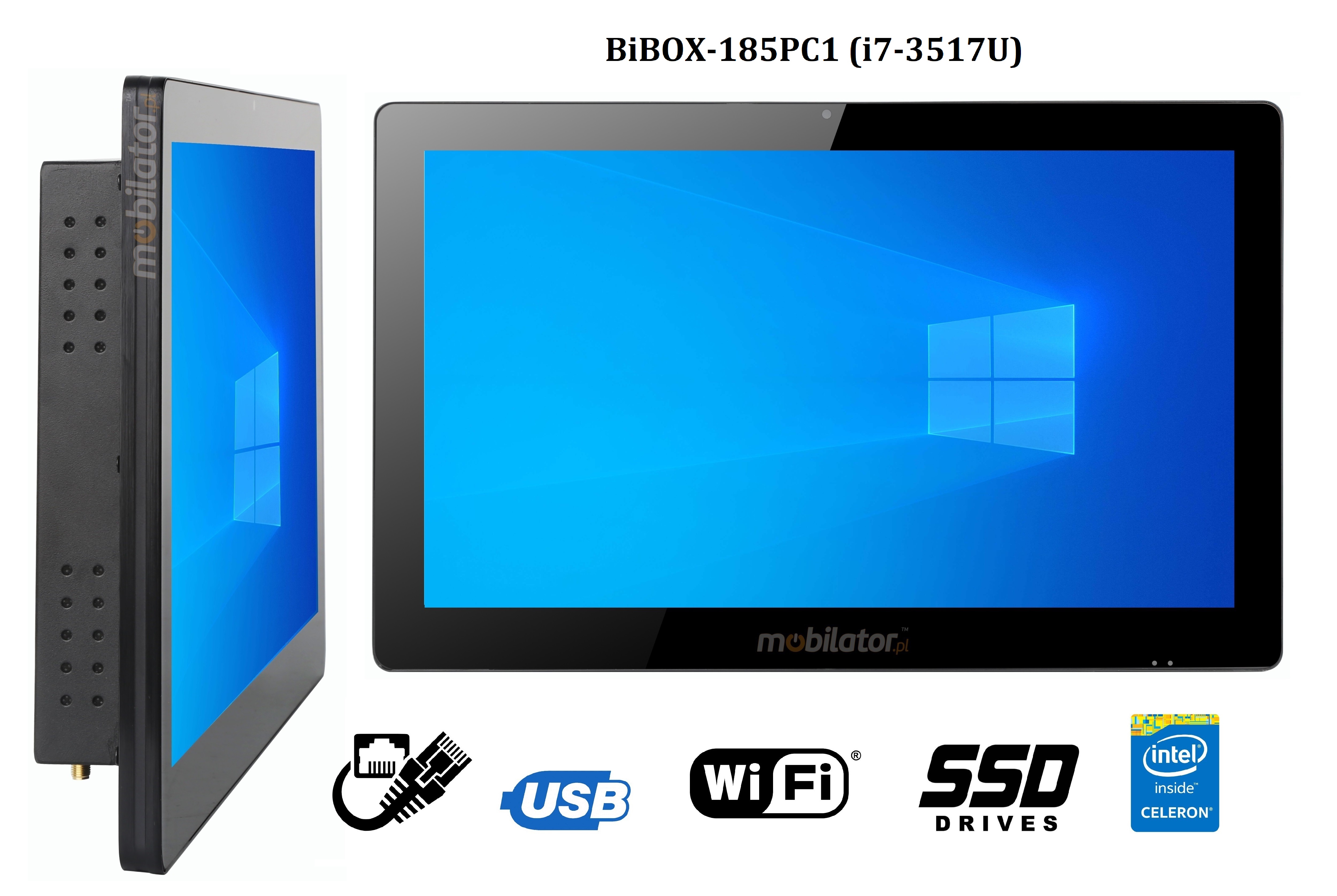 Wzmocniony, metalowy Panel PC przemysłowy BiBOX-185PC1 posiada odporny na wodę i zadrapania 18.5" ekran LED. Rozdzielczość 1366x768 oferuje dobrą jakość obrazu, a wysoka jasność w zakresie 250 cd/m² daje lepsze nasycenie barw i kontrast oraz pozwala na znacznie poprawioną widoczność nawet w przypadku padających na ekran promieni słonecznych. Wyświetlacz typu pojemnościowego zapewnia użytkownikowi wyraźny obraz i łatwość obsługi przy pomocy dotyku.