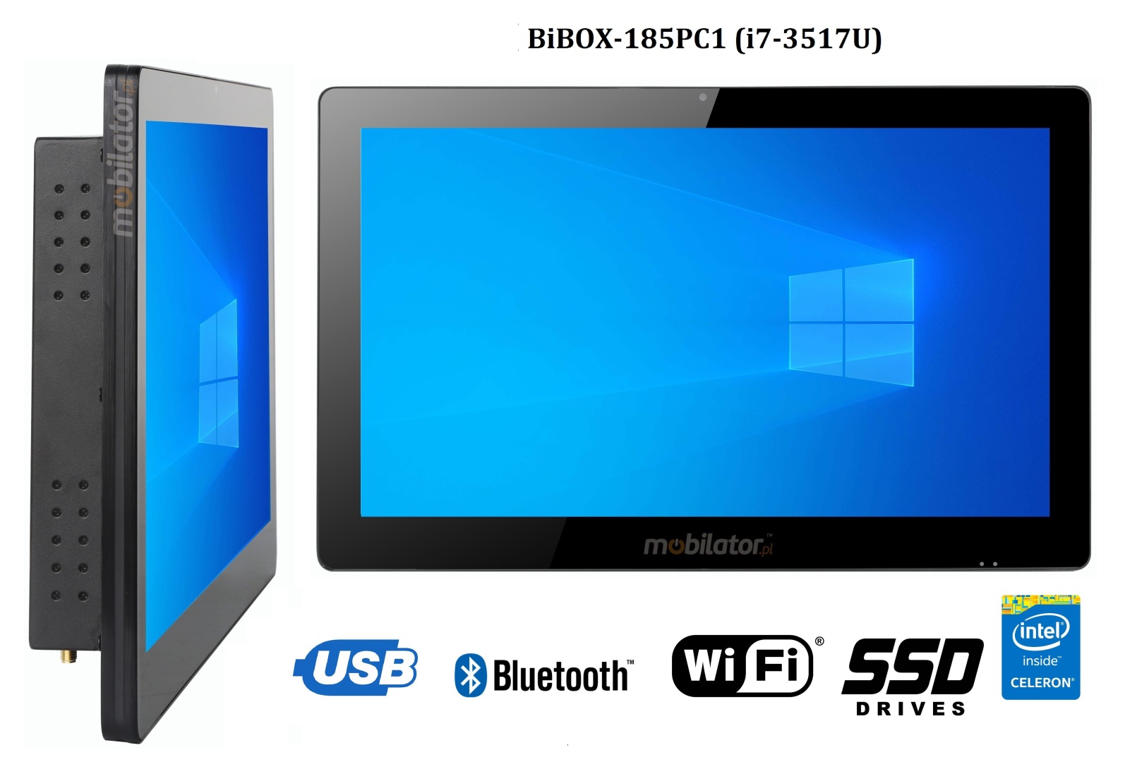 Wzmocniony, metalowy Panel PC przemysłowy BiBOX-185PC1 posiada odporny na wodę i zadrapania 18.5" ekran LED. Rozdzielczość 1366x768 oferuje dobrą jakość obrazu, a wysoka jasność w zakresie 250 cd/m² daje lepsze nasycenie barw i kontrast oraz pozwala na znacznie poprawioną widoczność nawet w przypadku padających na ekran promieni słonecznych. Wyświetlacz typu pojemnościowego zapewnia użytkownikowi wyraźny obraz i łatwość obsługi przy pomocy dotyku.
