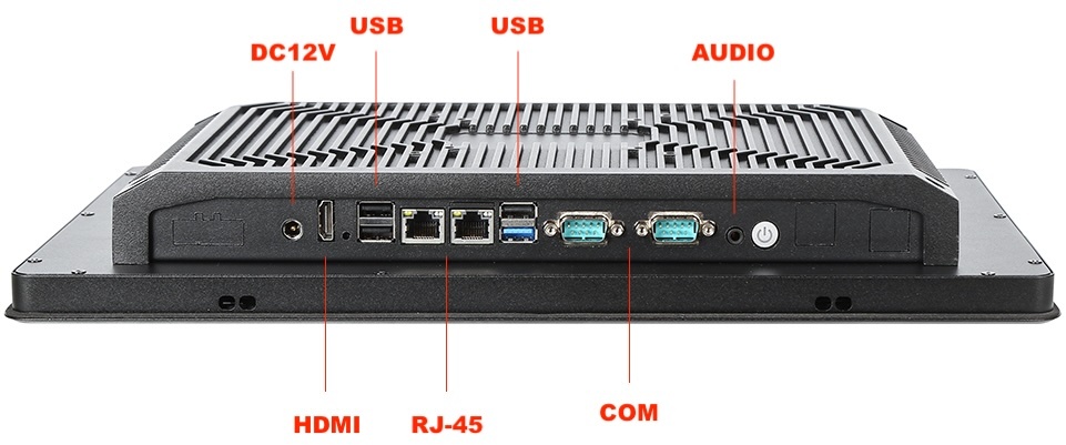 Komputer panelowy BiBox 19-I58 zapewnia bogaty zestaw złączy, gwarantując maksymalną funkcjonalność w środowisku logistycznym i produkcjnym. Urządzenie oferuje cztery porty USB, wyjście HDMI do transmisji obrazu, dwa porty LAN dla stabilnej komunikacji sieciowej oraz dwa porty szeregowe RS-232 (możliwa zamiana jednego portu na RS485 lub RS422), niezbędne do integracji z systemami przemysłowymi. Panel wspiera pełne funkcje audio, w tym wejście mikrofonowe (MICx1) i wyjście słuchawkowe (EARx1). Zasilanie odbywa się prądem stałym 12V, a konstrukcja została pozbawiona przestarzałego portu VGA, podkreślając nowoczesny charakter urządzenia. Na życzenie klienta możliwe jest dołożenie 4 dodatkowych portów RS-232.