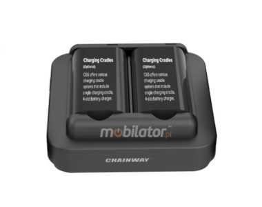 Stacja ładująca firmy Chainway pozwala na wygodne i szybkie ładowanie dwóch baterii do uchwytu pistoletowego jednocześnie.