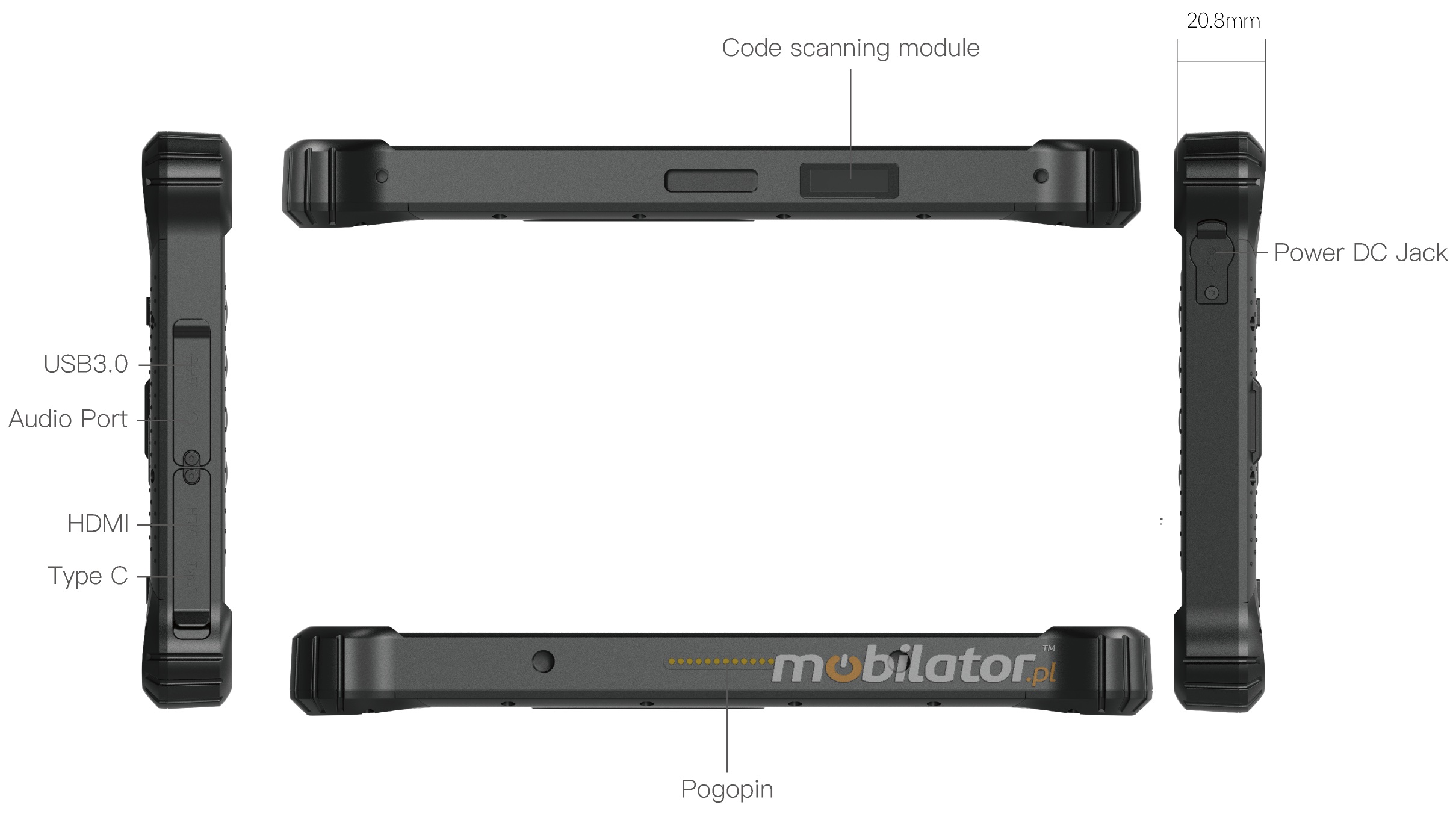 USB 3.0 | USB-C | Jack 3.5mm | SIM | DC 12V | HDMI 2.0 | Pogo