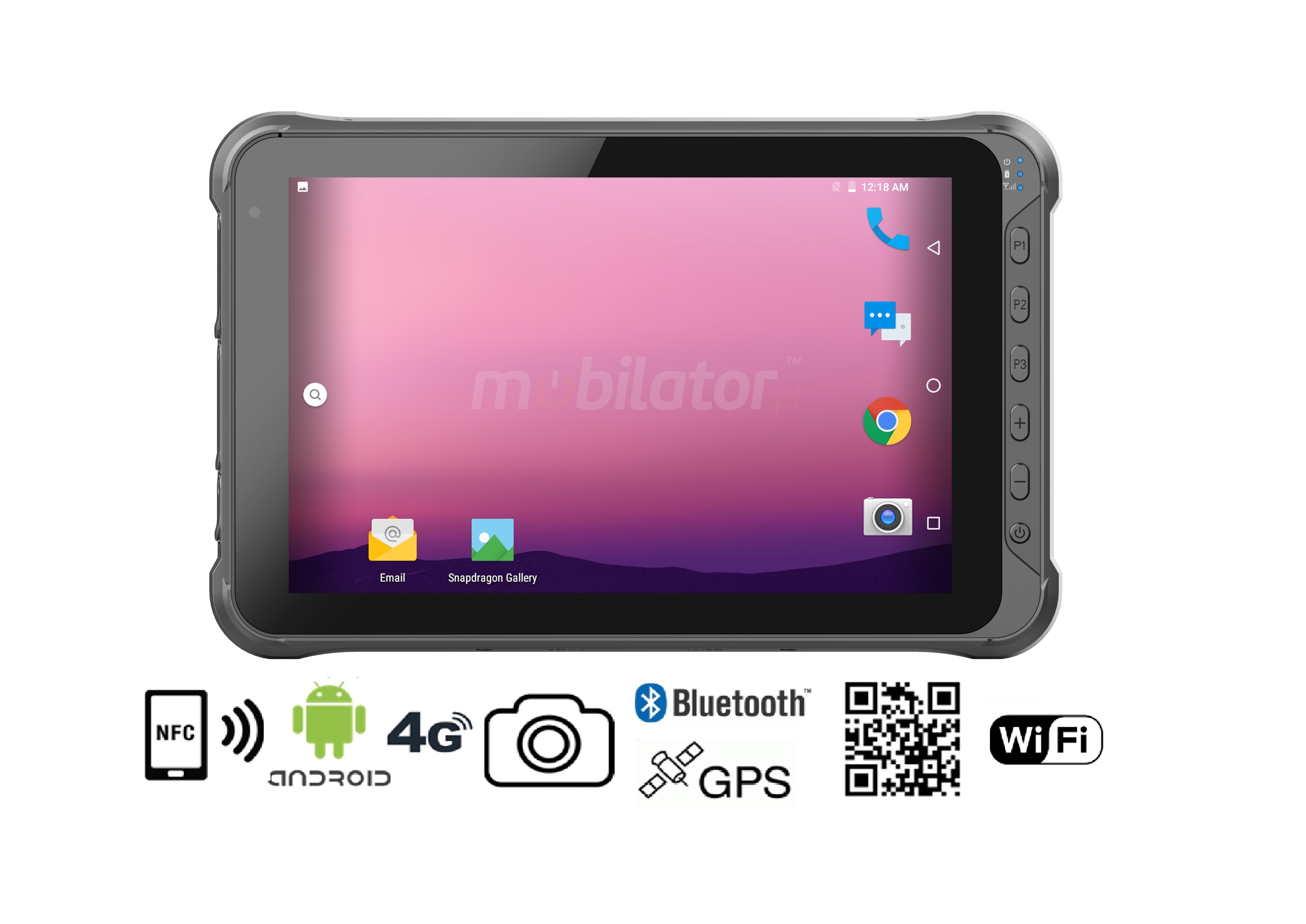 W pyłoszczelnym tablecie przemysłowym zastosowano wydajny i energooszczędny procesor MSM8953 (8x2.0GHz). W jego wnętrzu znajduje się osiem współdziałających rdzeni umożliwiających bardziej efektywne przetwarzanie wielu zadań jednocześnie. Współużytkowana pamięć cache, w której wykorzystango o wielopoziomową hierarchię, jest dynamicznie przydzielana dla każdego rdzenia procesora w zależności od obciążenia. Doprowadza to do zmniejszenia średniego czasu dostępu do pamięci głównej. Usprawniona technologia kart graficznych pozwala cieszyć się filmami w pełnej rozdzielczości i jakości HD. Niski pobór energii gwarantuje długi czas pracy na zasilaniu akumulatorowym.