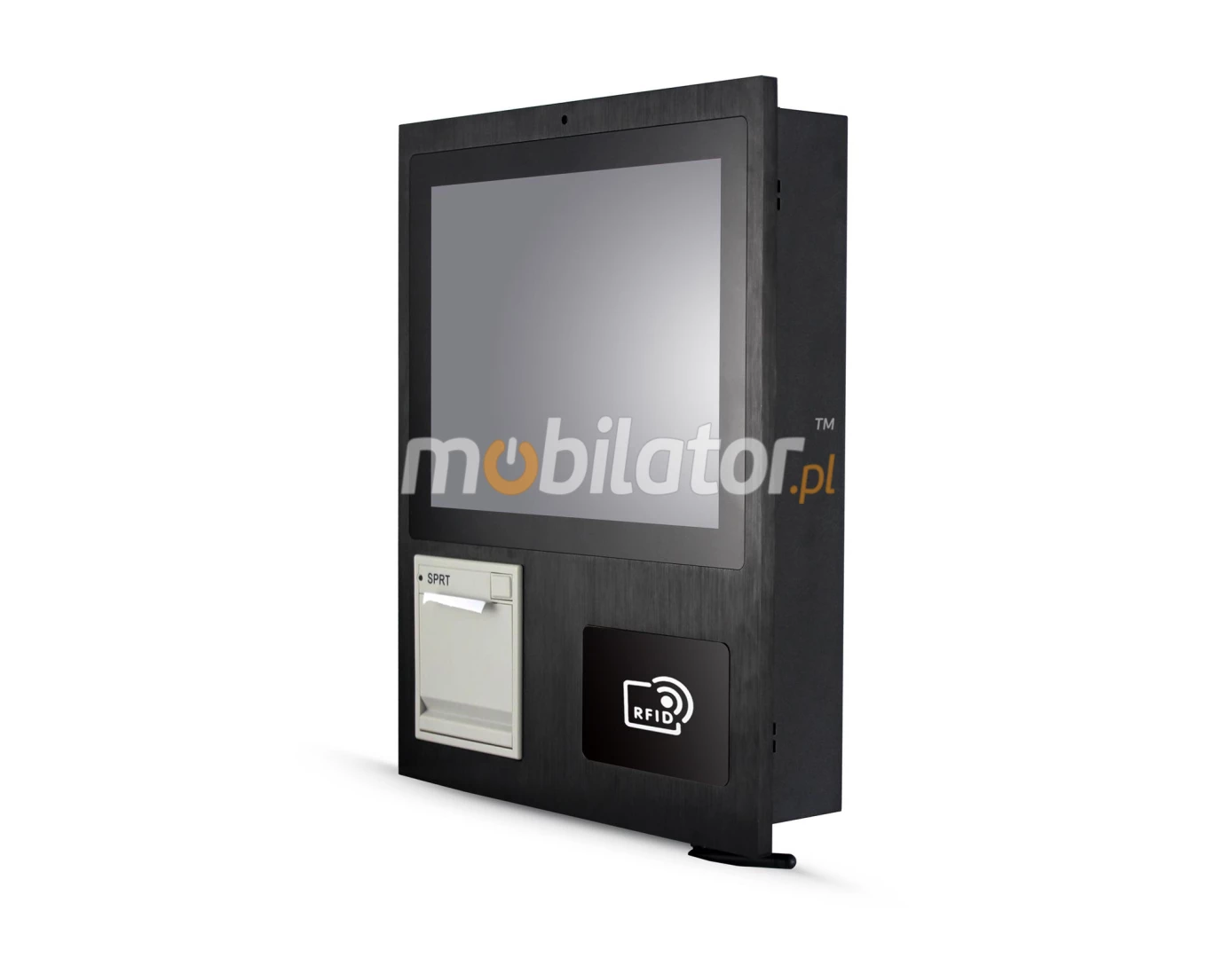 The resolution 1024x768 offers good image quality and the high brightness in the 350cd/m2 range gives better color saturation and contrast and allows for significantly improved visibility even in the case of sunrays falling on the screen. The Panel PC has a built-in printer, RFID reader and barcode scanner 1D or 2D.
