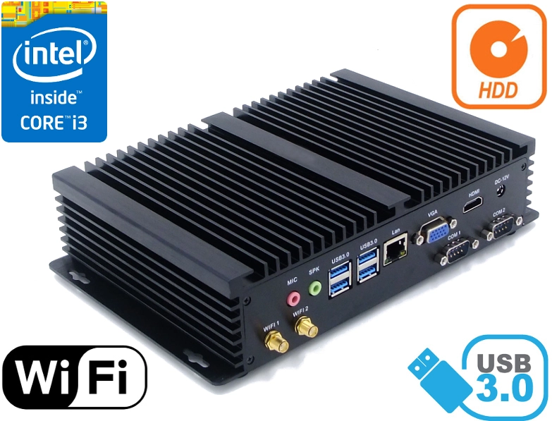 The industrial fanless MiniPC HyBOX 04PMF-i3-4010u uses a special method of cooling. This cooling takes place mainly by means of housing having a very large surface (longitudinal lamells, ribs) - for heat dissipation. Fan used inside the computer is designed to rapidly drain hot air from the CPU, allowing MiniPC to reach more efficiently and faster cooling.