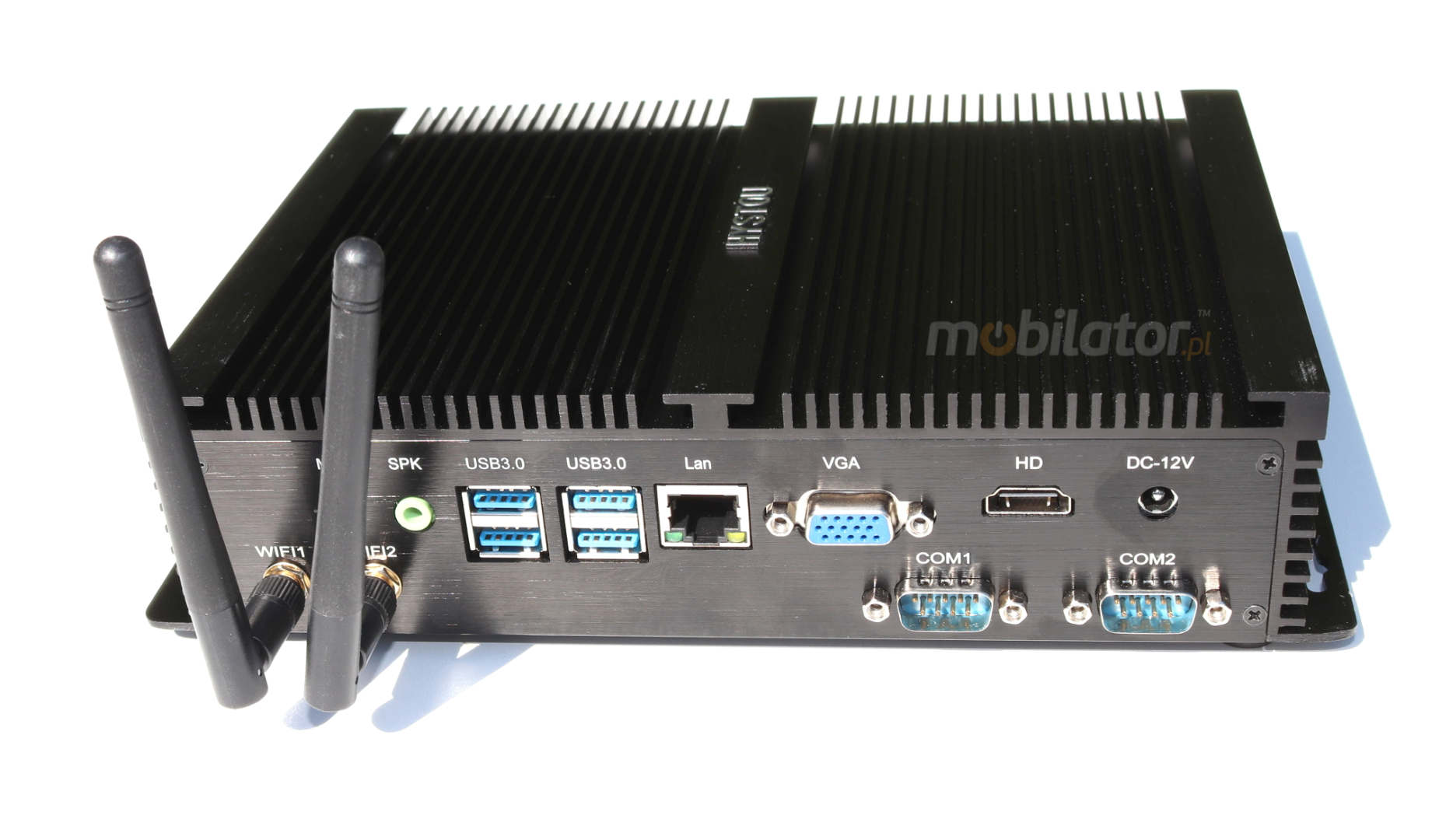 The industrial fanless MiniPC HyBOX 04PMF-i3-5005u uses a special method of cooling. This cooling takes place mainly by means of housing having a very large surface (longitudinal lamells, ribs) - for heat dissipation. Fan used inside the computer is designed to rapidly drain hot air from the CPU, allowing MiniPC to reach more efficiently and faster cooling.