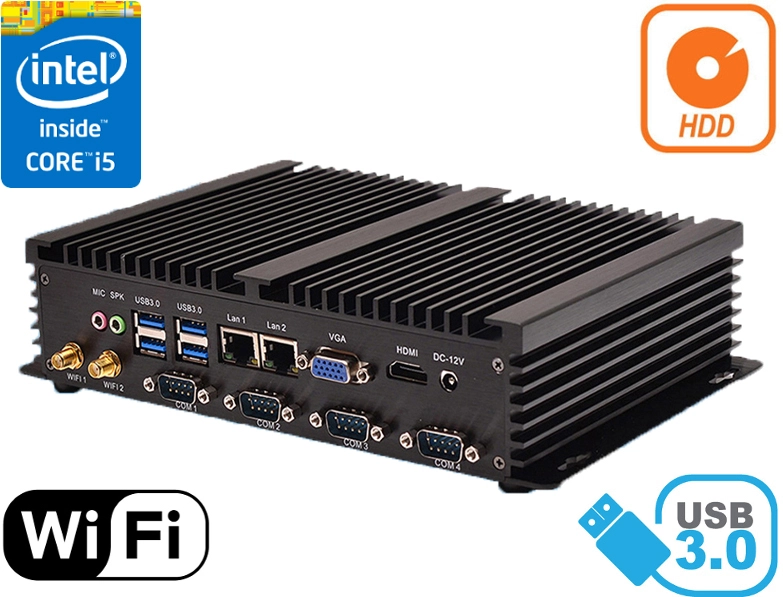 The industrial fanless MiniPC HyBOX 04PMF-i5-3317u uses a special method of cooling. This cooling takes place mainly by means of housing having a very large surface (longitudinal lamells, ribs) - for heat dissipation. Fan used inside the computer is designed to rapidly drain hot air from the CPU, allowing MiniPC to reach more efficiently and faster cooling.