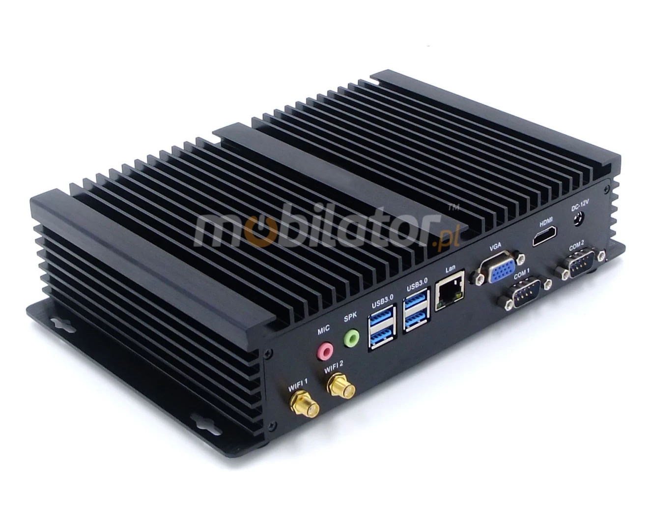 The industrial fanless MiniPC HyBOX 04PMF-i3-4010u uses a special method of cooling. This cooling takes place mainly by means of housing having a very large surface (longitudinal lamells, ribs) - for heat dissipation. Fan used inside the computer is designed to rapidly drain hot air from the CPU, allowing MiniPC to reach more efficiently and faster cooling.