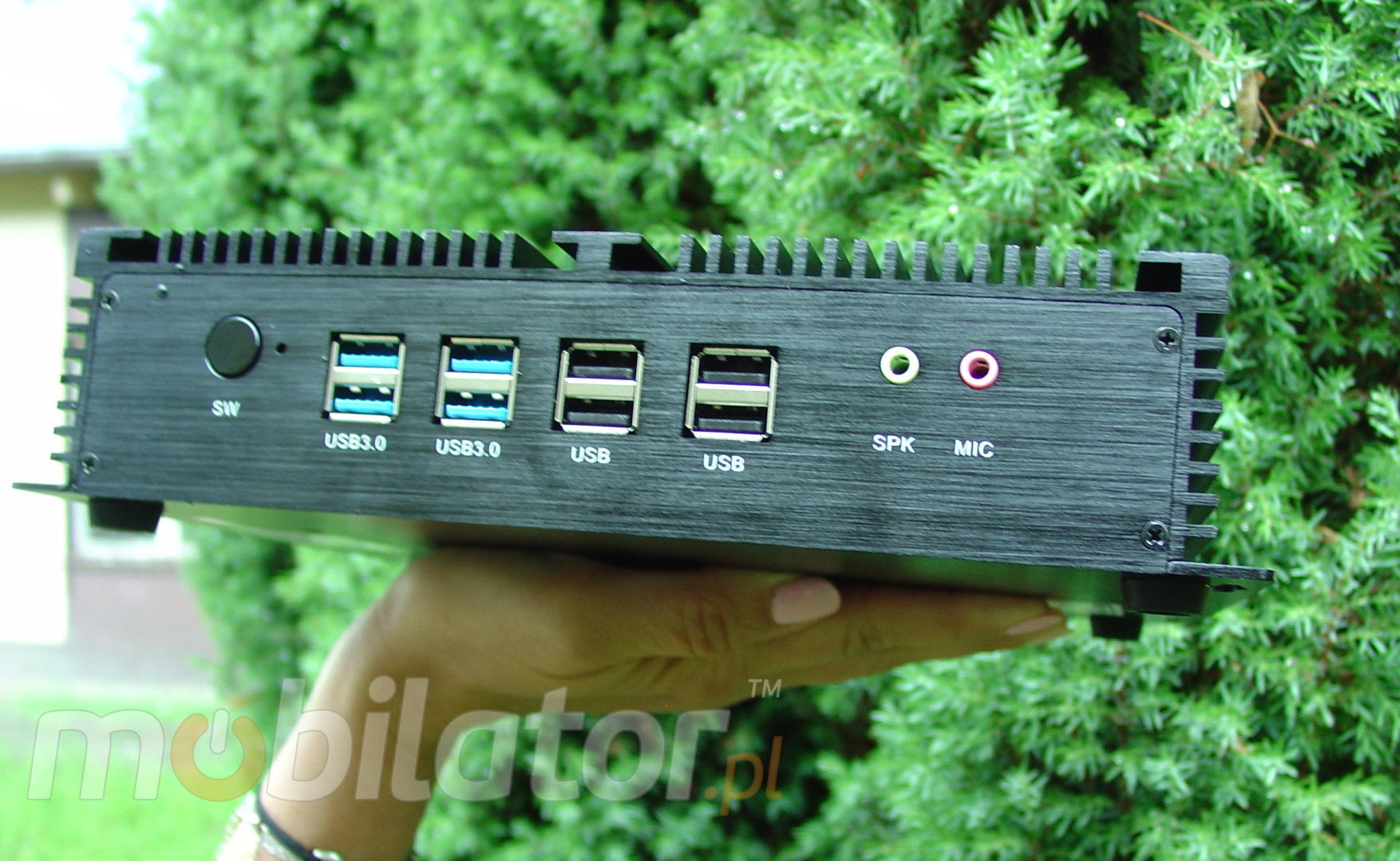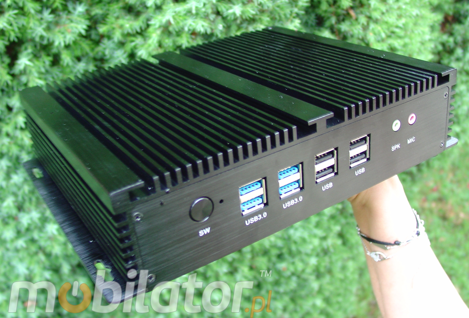 The industrial fanless MiniPC HyBOX 0B4PMF-i7-5550U uses a special method of cooling. This cooling takes place mainly by means of housing having a very large surface (longitudinal lamells, ribs) - for heat dissipation. Fan used inside the computer is designed to rapidly drain hot air from the CPU, allowing MiniPC to reach more efficiently and faster cooling.