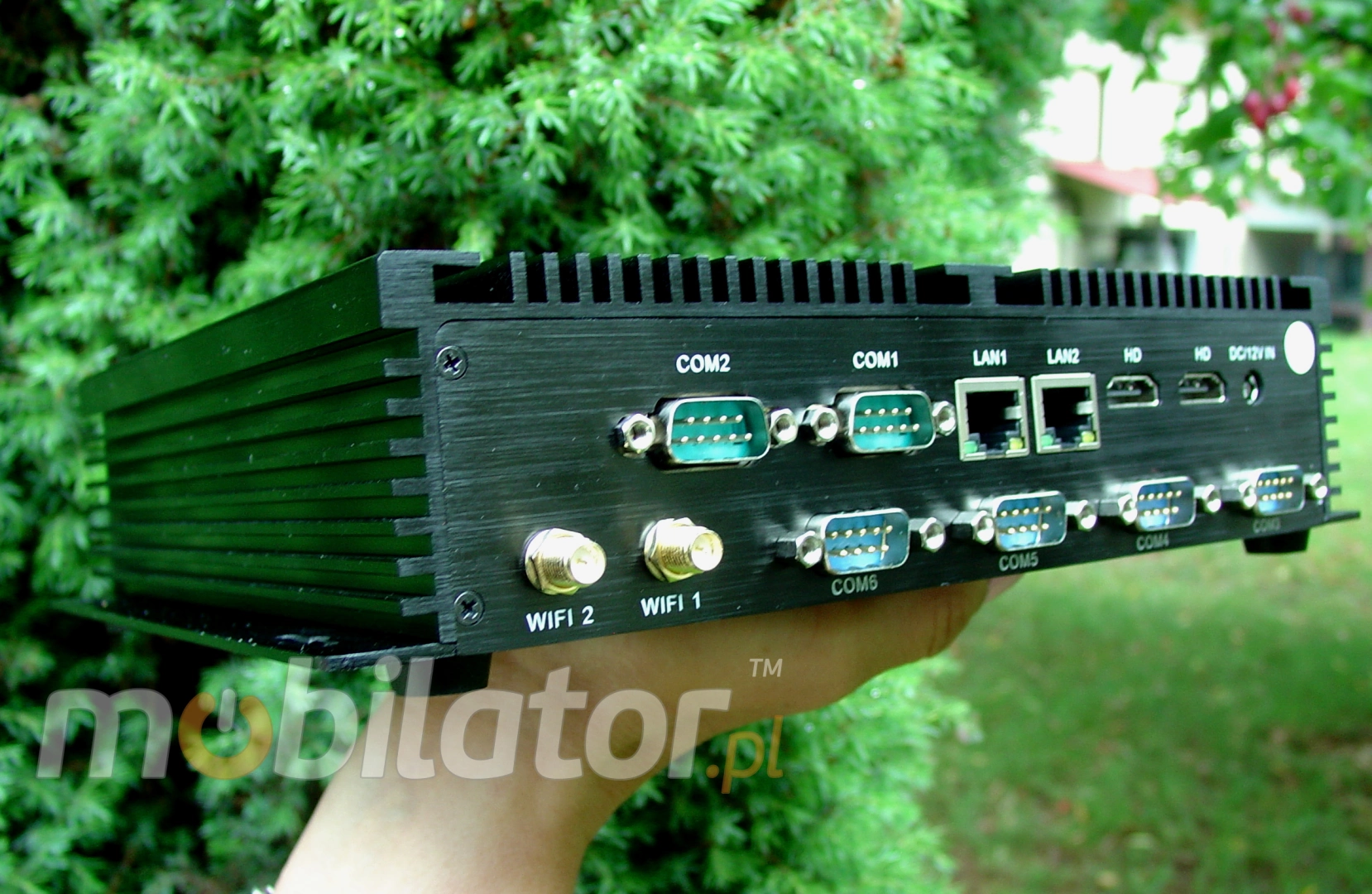Integrated card - Intel 82574L Gigabit and the Wi-Fi module allow connection to the network. The computer is equipped with: two LAN ports, two HDMI ports, four USB 3.0 ports, four USB 2.0 ports, six COM(RS232) ports, one Mic and one Speaker port and a built-in connector on the motherboard: SATA port and mSATA port.
