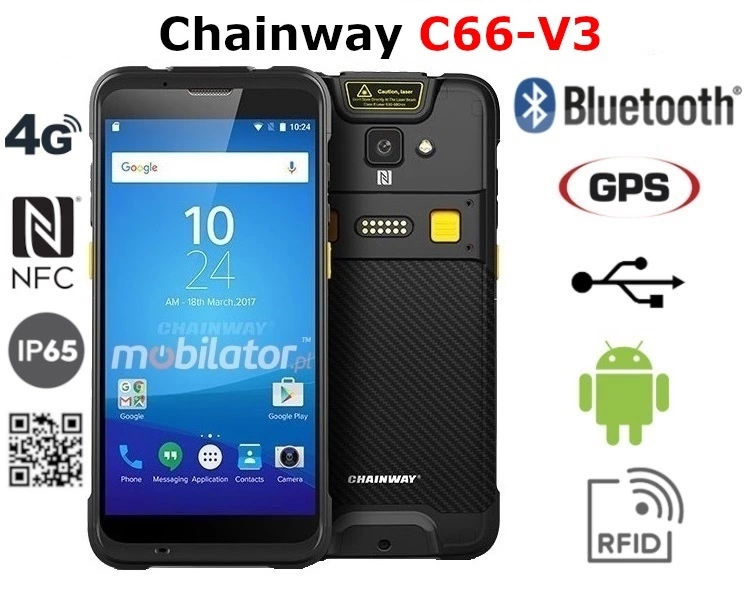 Chainway C66-V3 is a modern, waterproof industrial smartphone designed for extreme applications. It has a specially designed, reinforced construction that meets the requirements of IP65, which confirms the protection of the device against dust and water.
