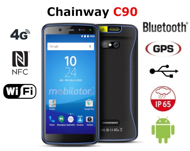 Chainway C90 is a modern, waterproof industrial smartphone designed for extreme applications. It has a specially designed, reinforced construction that meets the requirements of IP65, which confirms the protection of the device against dust and water.