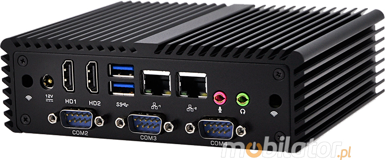 Integrated card - Realtek RTL8111E 10/100/1000 Controller and WiFi module allow connection to the network. The computer is equipped with: two LAN ports, two HDMI ports, two USB 2.0 ports, four USB 3.0 ports, four COM(RS232) ports one Audio input and one Mic output.