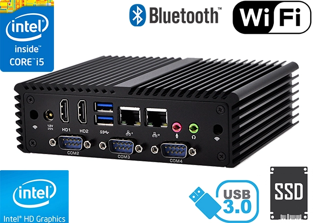 Integrated card - Realtek RTL8111E 10/100/1000 Controller and WiFi+Bluetooth module allow connection to the network. The computer is equipped with: two LAN ports, two HDMI ports, two USB 2.0 ports, four USB 3.0 ports, four COM(RS232) ports one Audio input and one Mic output.
