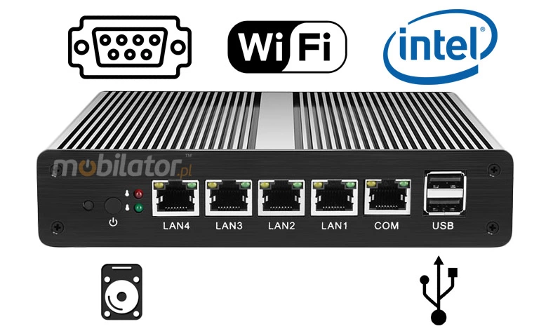 | Front panel | Power On/Off / 4x LAN / 2x USB 2.0 / 1x COM |
