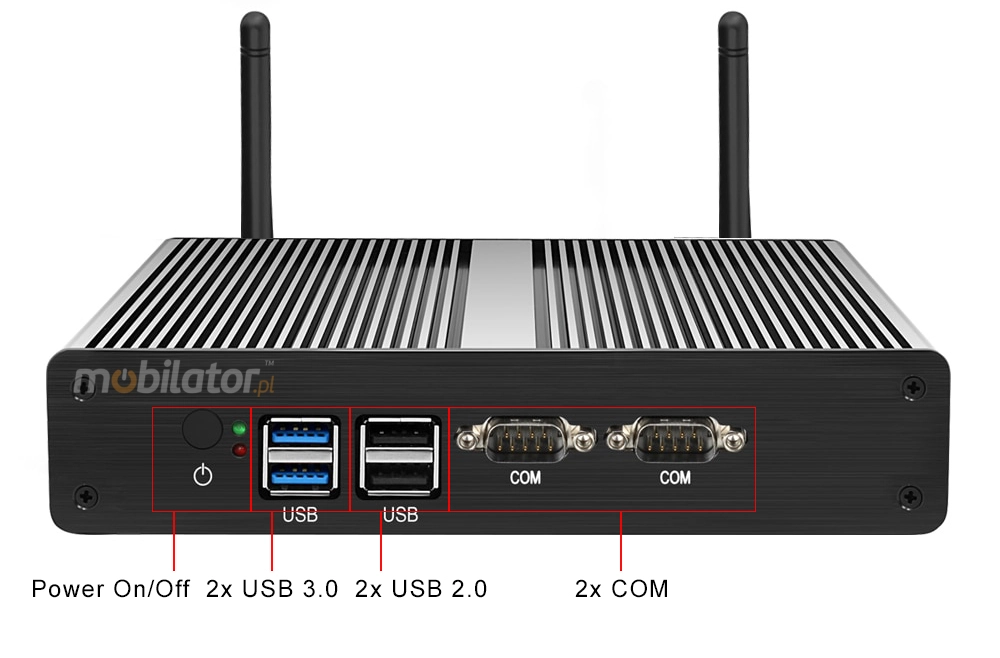The industrial Mini PC uses a proven cooling system, based only on solid elements, mainly heat sinks. The system uses the phenomenon of metals passing thermal energy into the environment - there are no additional moving elements in the form of eg fans. This solution ensures noiseless operation, lower failure rate and greater protection against dust and other dirt while reducing the amount of energy consumed.