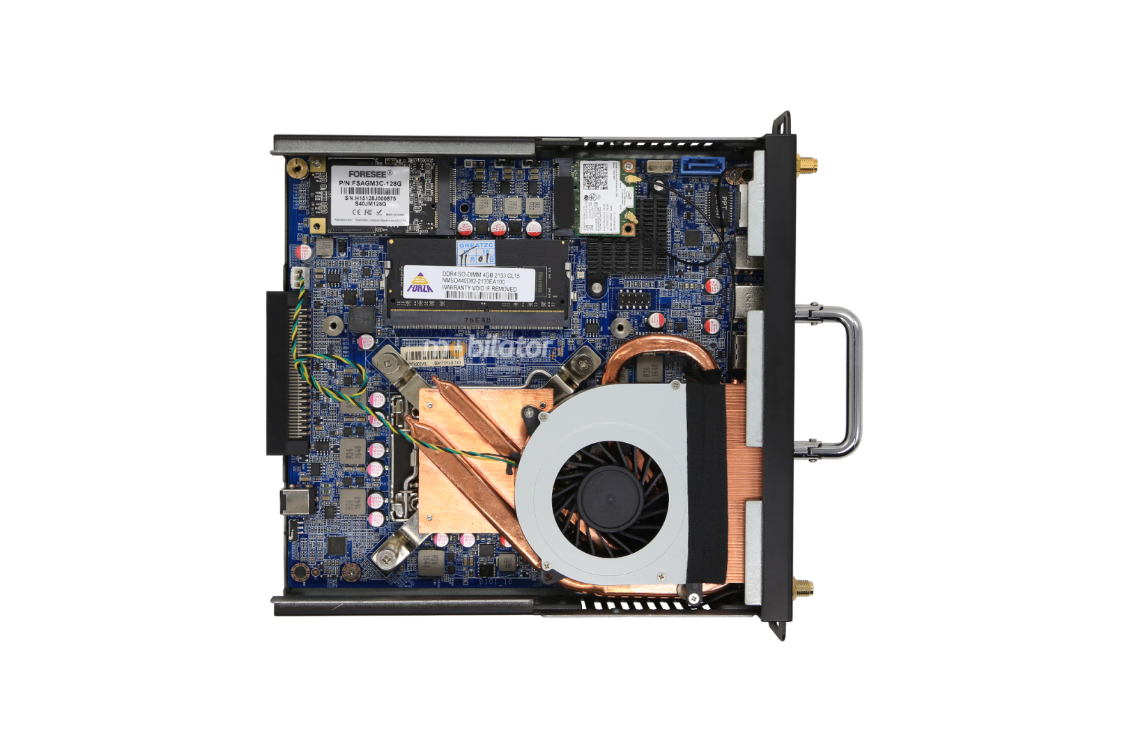 Detailed device specification is available in the "Technical data" tab.The industrial Mini PC uses a proven cooling system, based only on solid elements, mainly heat sinks. The system uses the phenomenon of metals passing thermal energy into the environment through openings in the housing. This solution provides better cooling in relation to pasive cooling.