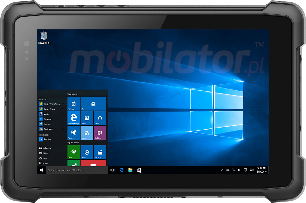 Detailed specification of the device is available in the tab "Technical data".The dustproof industrial tablet uses a powerful and energy-saving Intel Cherry Trail Z8350 processor (4x 1.92 GHz). Inside, there are four cores that work together to process multiple tasks more efficiently. Shared cache, which is used in a multi-level hierarchy, is dynamically allocated to each processor core depending on the workload. This leads to a reduction in the average access time to main memory. Improved graphics card technology allows you to enjoy movies in full definition and HD quality. Low energy consumption guarantees long battery life.
