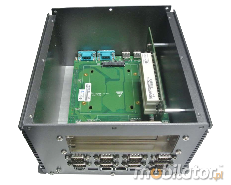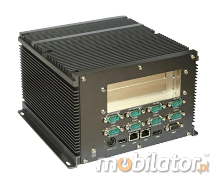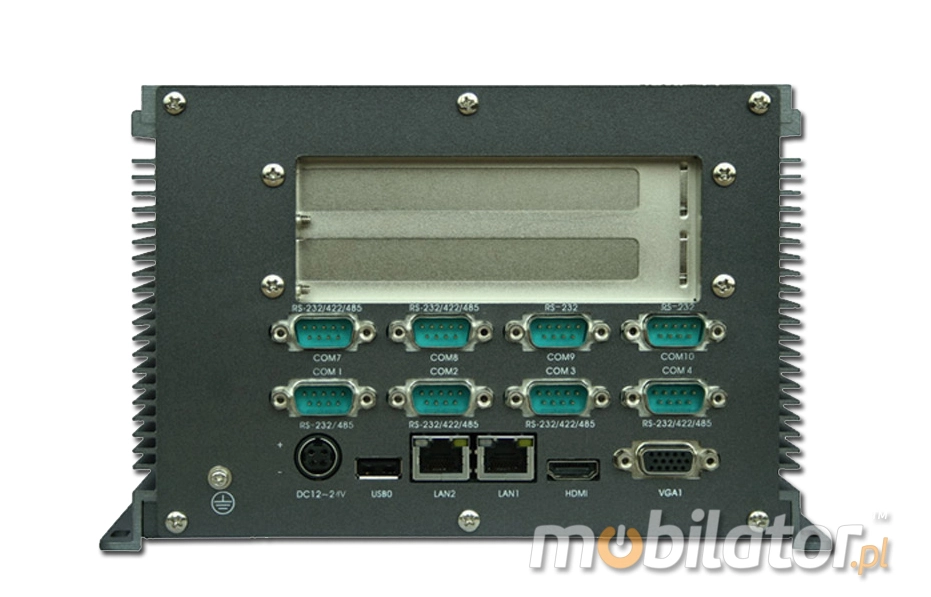 Integrated card - Intel RTL8111E 1000M (optional 3G module) allow connection to the network. The computer is equipped with: two LAN port, ten COM ports (RS232) - in this can be 1x COM(RS422 or 485), one VGA output, one HDMI output, four USB 2.0 ports, one PCI connector, CF card reader, SIM slot, one way audio, one microphone input.