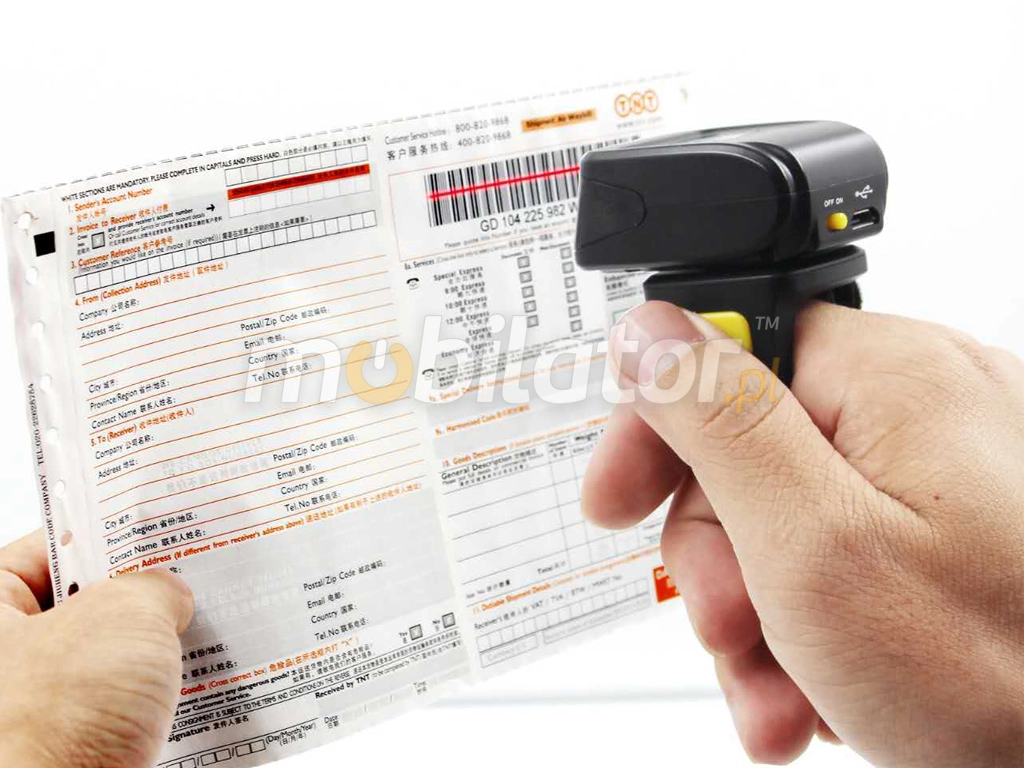 MobiScan Fingering FS2D-Alar is small size and powerful new generation barcode scanner.It design for picking and sorting application ,enable your operator to free hand and improve operational efficiency in your warehouse,distribution center and retail store. You never need setting an item down to check paper work order or picking up handheld scanner. Operator even no need to put heavy pakage to the desktop for scan ,it will save more time and physical strength. Compare with common wired handheld scanner, FS2D-Alar wearable scanner can increase 15% -30% productivity !