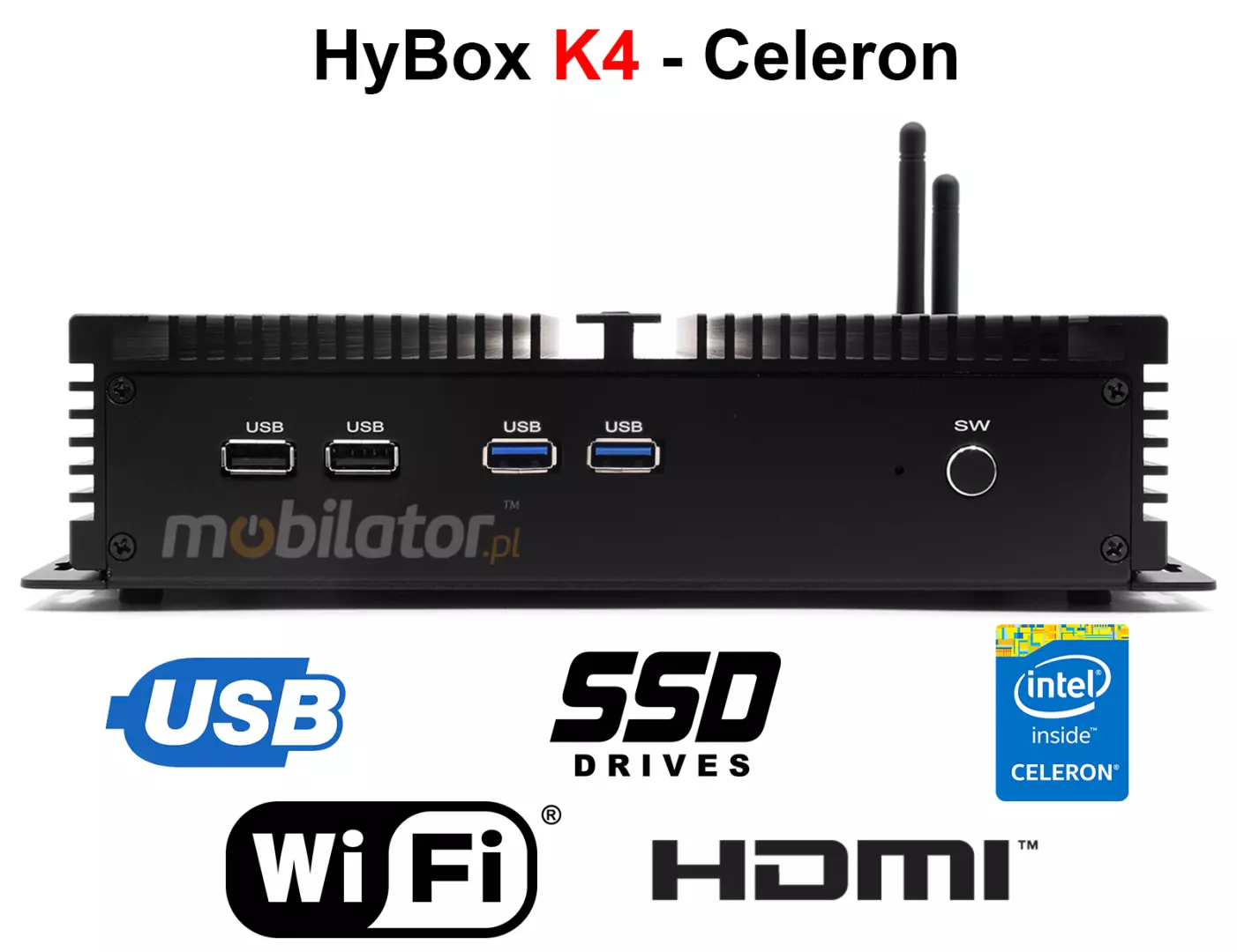 Small dimensions industrial computers excel in environments where dust, dirt and moisture predominate. They are ideal for applications requiring quiet operation. Small and reliable MiniPC use heat-pipe technology and aluminum fins for passive cooling. The robust mini Industrial Computer HyBOX K4 is a device designed for all industrial and non-continuous applications requiring continuous operation - 24 hours, 7 days a week.