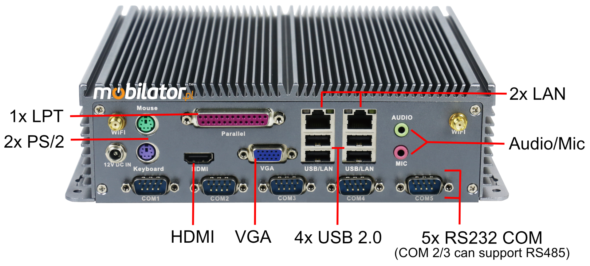 4xUSB 2.0 | 2x LAN | 1xHDMI 1xVGA | 1xLPT | 2x PS/2 | Audio/Mic 5x RS232 COM (COM2/3 can support RS485) |