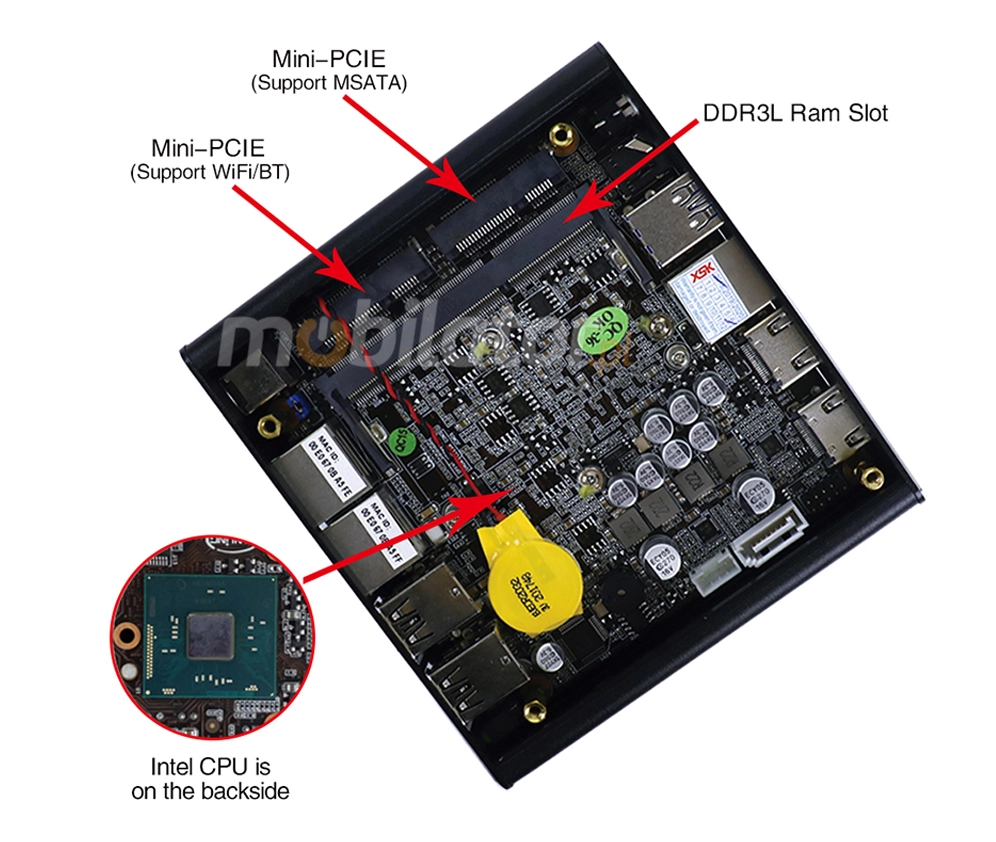 | Front panel | 2x USB 3.0 | Audio Jack | 2x HDMI | 1x COM | Power button | |