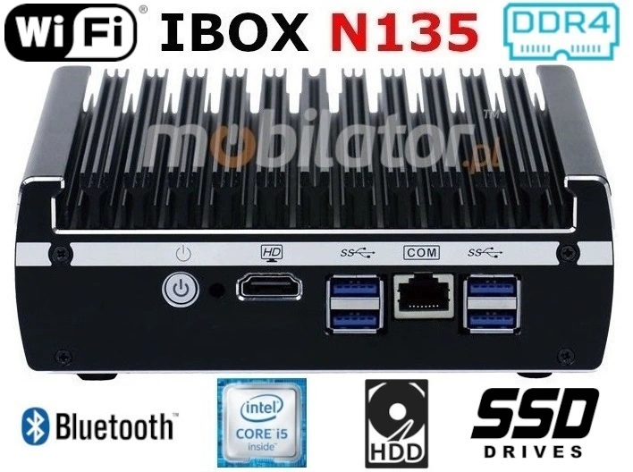 Small dimensions industrial computers excel in environments where dust, dirt and moisture predominate. They are ideal for applications requiring quiet operation. Small and reliable MiniPC use heat-pipe technology and aluminum fins for passive cooling. The robust mini Industrial Computer IBOX N135 is a device designed for all industrial and non-continuous applications requiring continuous operation - 24 hours, 7 days a week.