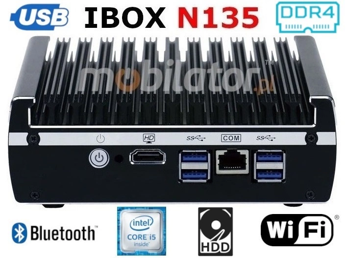 Small dimensions industrial computers excel in environments where dust, dirt and moisture predominate. They are ideal for applications requiring quiet operation. Small and reliable MiniPC use heat-pipe technology and aluminum fins for passive cooling. The robust mini Industrial Computer IBOX N135 is a device designed for all industrial and non-continuous applications requiring continuous operation - 24 hours, 7 days a week.