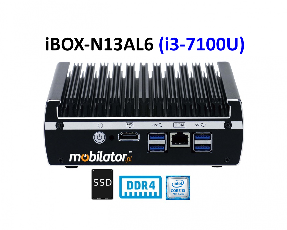 Small dimensions industrial computers excel in environments where dust, dirt and moisture predominate. They are ideal for applications requiring quiet operation. Small and reliable MiniPC use heat-pipe technology and aluminum fins for passive cooling. The robust mini Industrial Computer IBOX N13AL6 is a device designed for all industrial and non-continuous applications requiring continuous operation - 24 hours, 7 days a week.