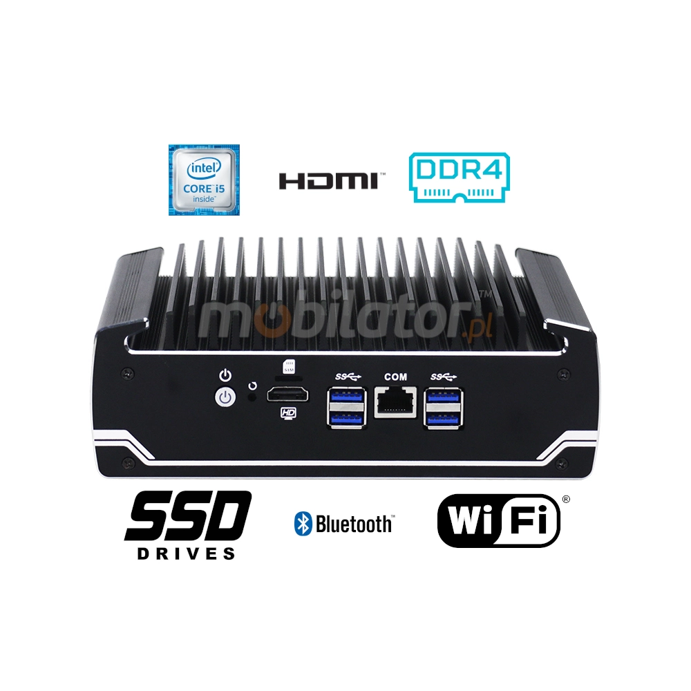 The industrial mini-computer IBOX N185 uses an efficient and energy-saving Intel Core i5-8250U processor. Inside it there are four cooperating cores enabling more efficient processing of many tasks at the same time. The shared cache memory in which the multilevel hierarchy is used is dynamically allocated to each processor core depending on the load. This reduces the average access time to the main memory.