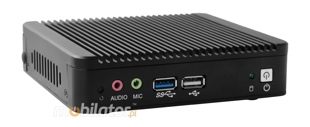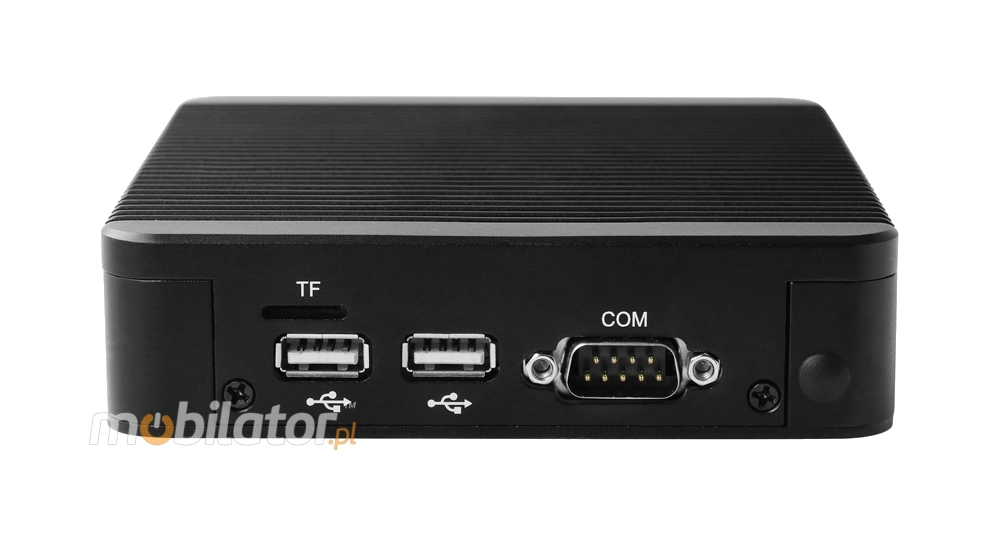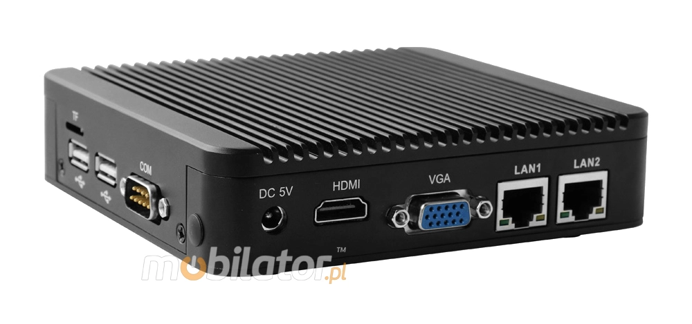 Integrated card - Intel 82583V 1000M and WiFi module allow connection to the network. The computer is equipped with: two LAN ports, one USB 3.0 port, one VGA output, three USB 2.0 ports, one HDMI output, one COM(RS232), TF card reader, one way audio, one microphone input.