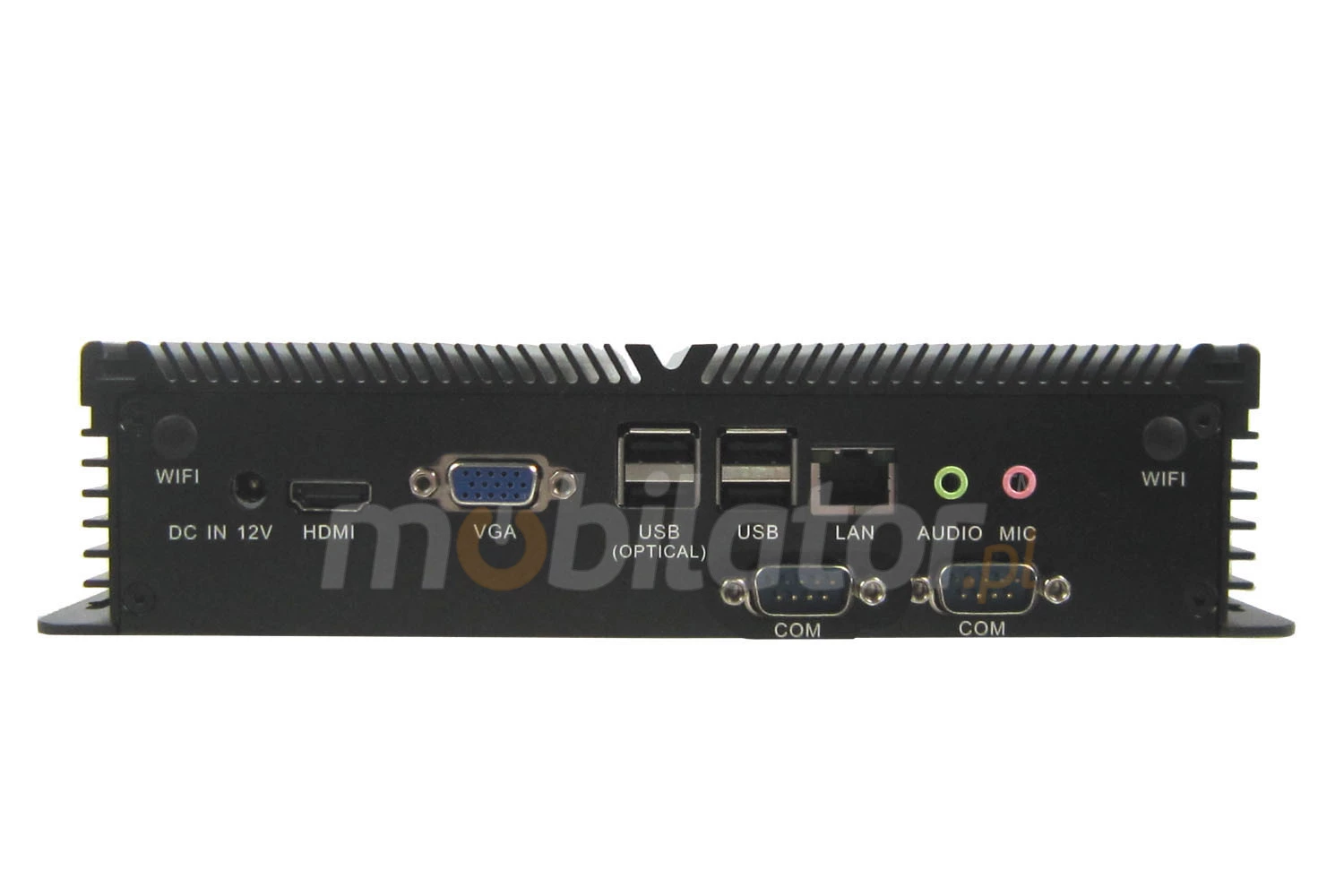 The industrial fanless MiniPC IBOX-203 uses a special method of cooling. This cooling takes place mainly by means of housing having a very large surface (longitudinal lamells, ribs) - for heat dissipation. Fan used inside the computer is designed to rapidly drain hot air from the CPU, allowing MiniPC to reach more efficiently and faster cooling.