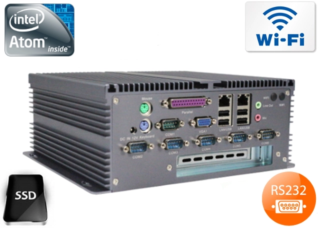 Integrated cards - Intel RTL8111E 1000M Lan and Wi-Fi modules allows connection to the network. The computer is equipped with: two LAN ports, one VGA port, six COM ports, one LPT port, one PCI port, two PS/2 ports, eight USB 2.0 ports, and a built-in connector on the motherboard: two SATA ports, one MiniSATA port, four USB 2.0 ports, and two Mini-PCIE connectors.