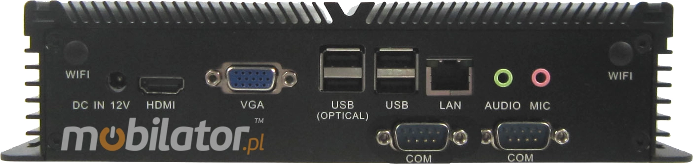 Integrated card - Intel 1000M Lan RTL8111E and WiFi module allows connection to the network. The computer is equipped with: one LAN port, two COM(RS232) port, one HDMI port, one VGA port, six USB 2.0 ports, one way audio, one input mic and a built-in connector on the motherboard: one PowerOUT connector, one S/PDIF connector, one LPT port and one Audio connector.