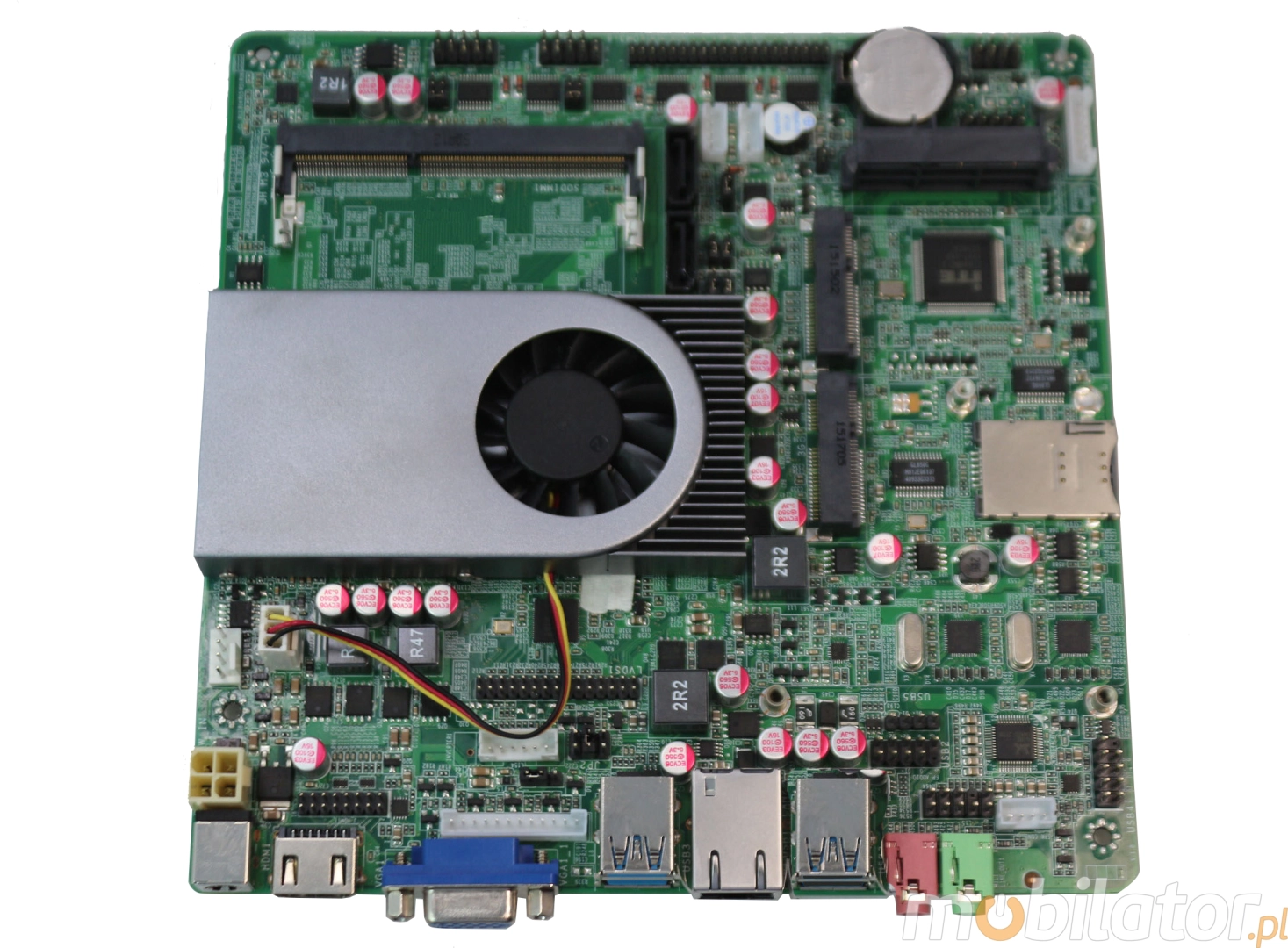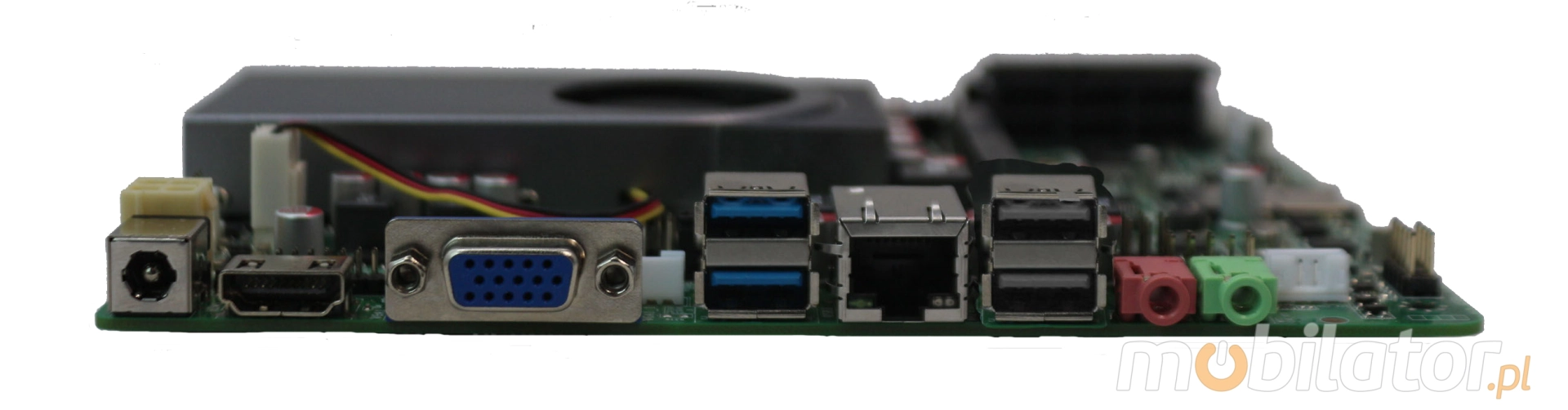 Integrated card - Intel 1000M Lan RTL8111E allows connection to the network. The computer is equipped with: one LAN port, four COM(RS232) port, one HDMI port, one VGA port, five USB 2.0 ports (max. 7xUSB), one USB 3.0 port, one way audio, one input mic and a built-in connector on the motherboard: one PowerOUT connector, one LVDS connector, one GPIO port and one Mini-PCIE connector.