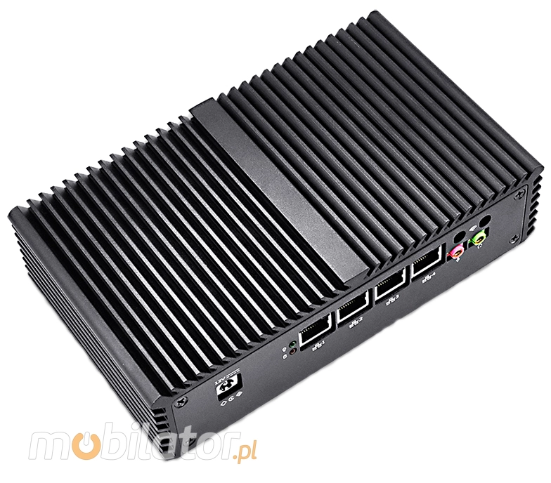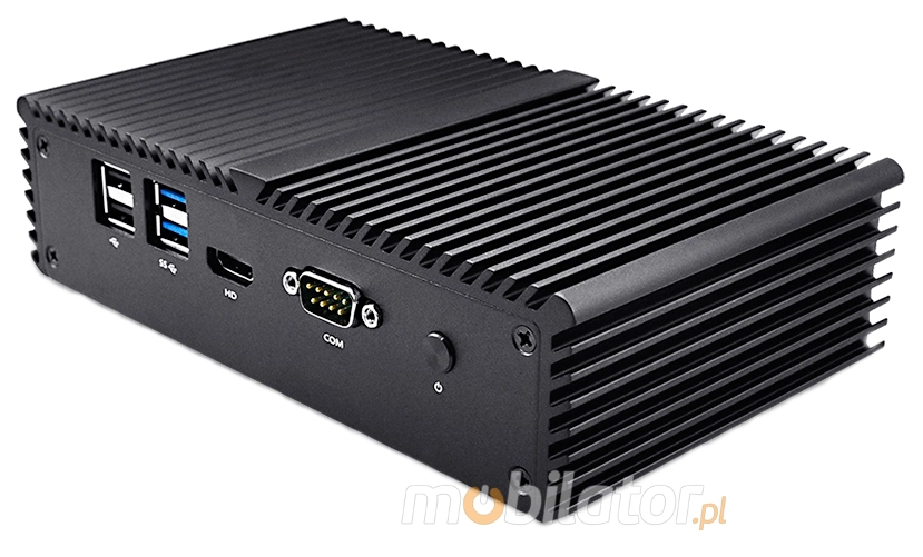 The Industrial Computer Fanless MiniPC mBOX Nuc Q350G4 uses a special method of cooling. This cooling takes place mainly by means of housing having a very large surface (longitudinal lamells, ribs) - for heat dissipation. Fan used inside the computer is designed to rapidly drain hot air from the CPU, allowing MiniPC to reach more efficiently and faster cooling.