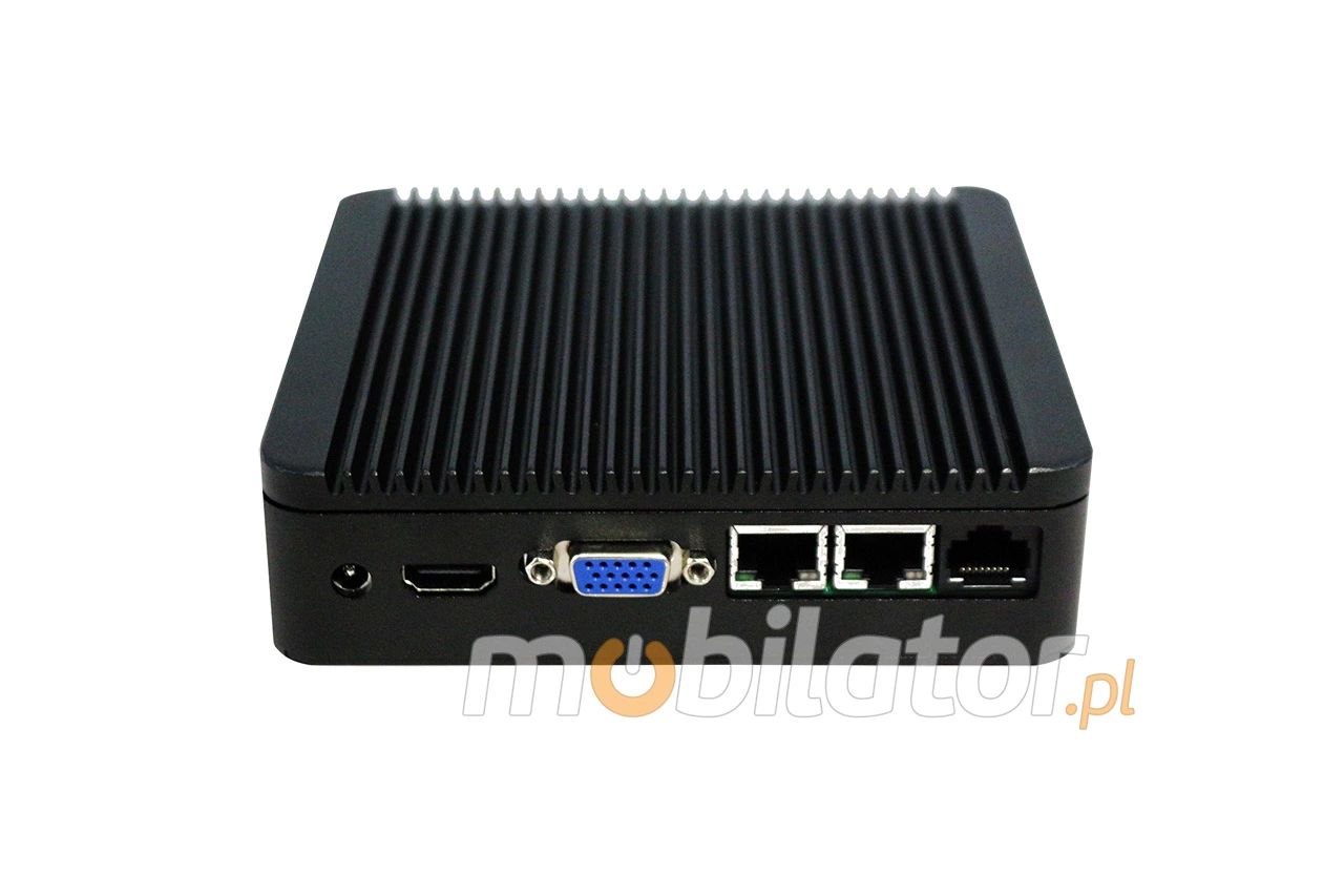 The industrial fanless MiniPC IBOX-Nano-J1900 uses a special method of cooling. This cooling takes place mainly by means of housing having a very large surface (longitudinal lamells, ribs) - for heat dissipation. Fan used inside the computer is designed to rapidly drain hot air from the CPU, allowing MiniPC to reach more efficiently and faster cooling.