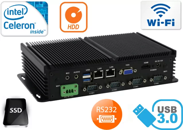 Integrated cards - Intel WGI211AT 1000M Lan and WiFi module allows connection to the network. The computer is equipped with: two LAN ports, one VGA port, six COM ports, one HDMI port, one GPIO interface one USB 3.0 ports, five USB 2.0 ports, SIM Card slot and a built-in connector on the motherboard: two SATA ports, one MiniSATA port, and two Mini-PCIE connectors.
