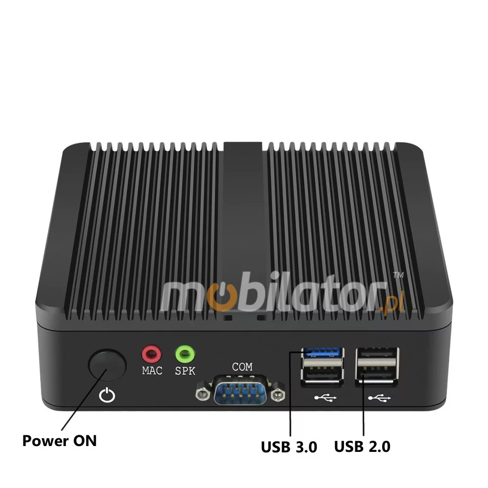 The industrial Mini PC uses a proven cooling system, based only on solid elements, mainly heat sinks. The system uses the phenomenon of metals passing thermal energy into the environment - there are no additional moving elements in the form of eg fans. This solution ensures noiseless operation, lower failure rate and greater protection against dust and other dirt while reducing the amount of energy consumed.
