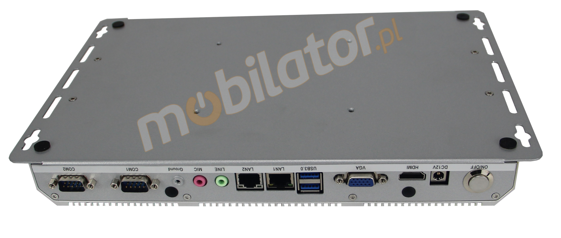 Power On/Off / 2x USB 2.0 / 2x Lan / HDMI / VGA / Audio / Mic / DC IN 12 V / 2x COM |