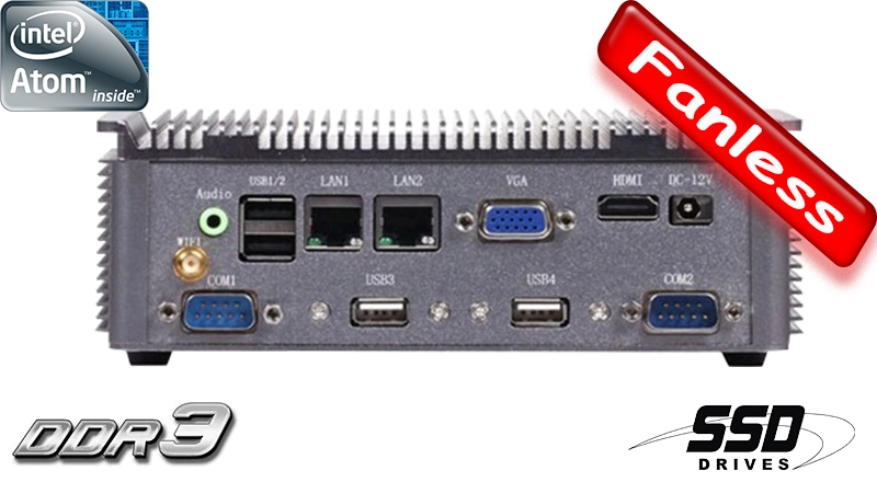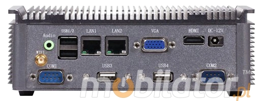 Integrated card - Intel RTL8111E 100M (optional WiFi module) allow connection to the network. The computer is equipped with: two LAN ports, two COM ports (RS232), one VGA output, four USB 2.0 ports, one HDMI output one way audio, one microphone input.